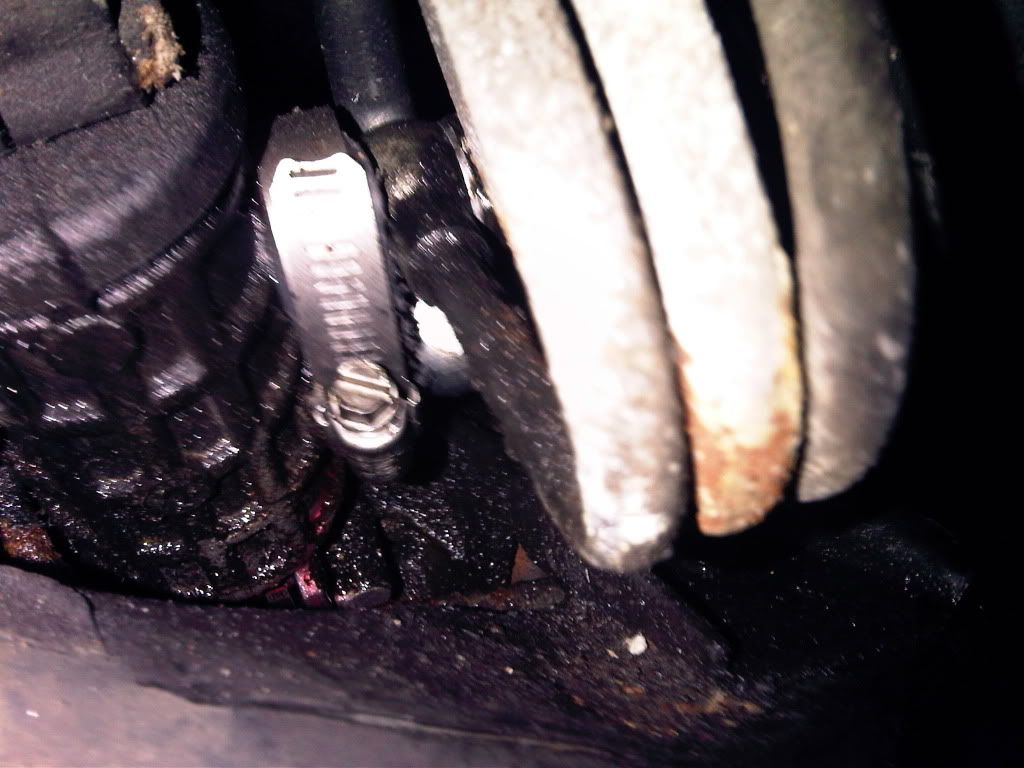I bought a piece of rubber hose and a circular clamp and put the hose over the two holes for the power steering connections and clamped it as tight as I could to try to keep the broken piece from falling off, as well as attempting to minimize the leak.  I took the power steering belt off.