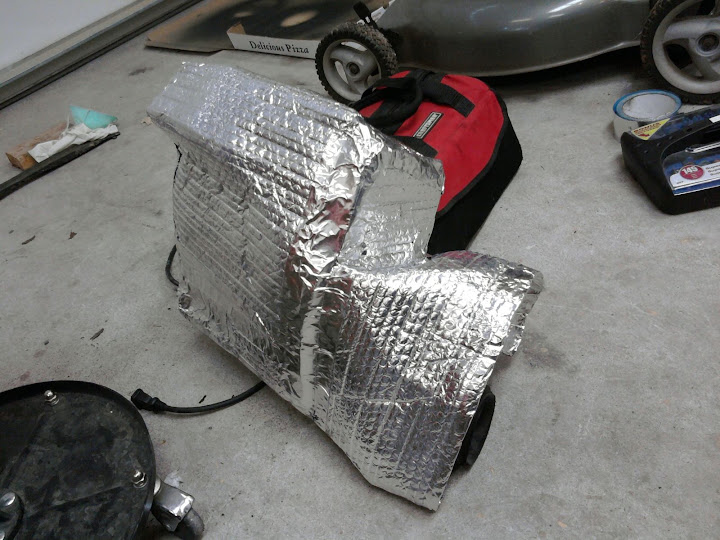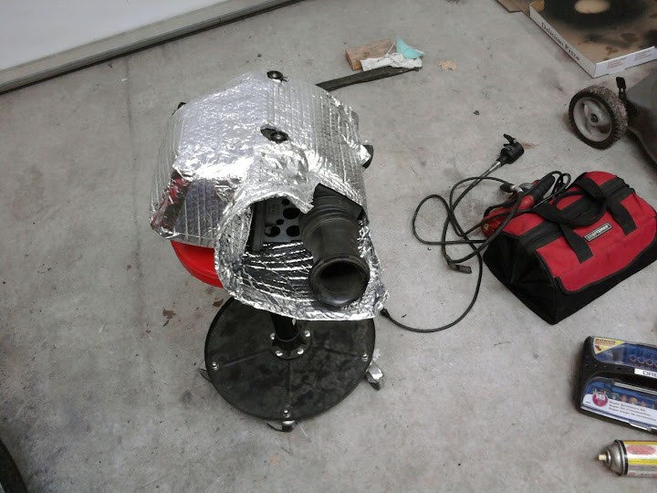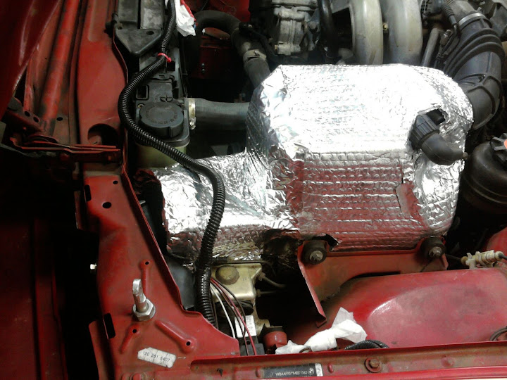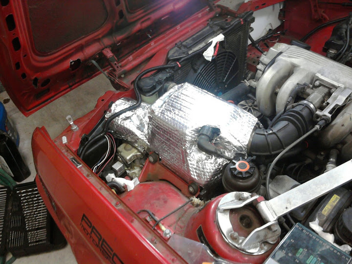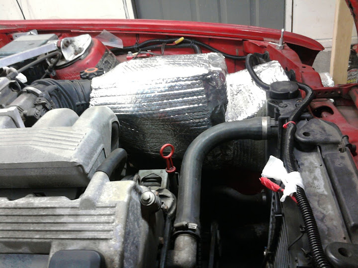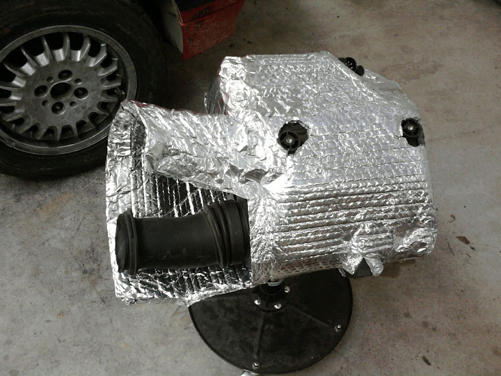 I basically removed and wrapped the stock airbox in the Reflectix usinig the aluminum duct tape to secure it. Then added an extra peice of reflectix in the engine side for more insulation. And finally added another peice to the front of the box to cover the hole in the front so it could only get cold air from the headlight area. I added aluminum tape to the front edges of the flap that extends to the headlight opening so that it could be easily bent and hold its position.