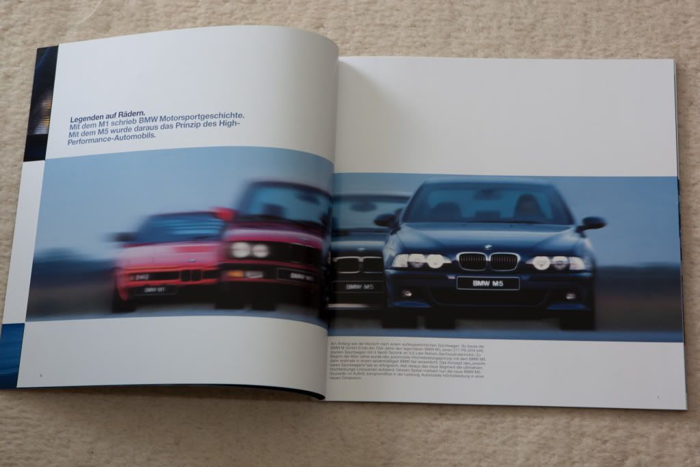 06) Original BMW E39 M5 Sales Brochure - Printed 1998 in Munich Germany. Language is German. Large format measuring 28cm x 28cm, 57 pages. Includes M5 history, driving impression from Prince Leopold of Bayern through the Alps, St. Moritz and Monaco as well as 2 4-page pull out color poster of the M5 and lastly all of the specifications, color options and dealer options.