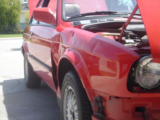 So as you guys may recall, I rolled into a ditch a few weeks ago and killed my door and fender in the process. I immediately replaced the door, but drove around with my f'd up fender 'till today. I replaced it with a "new" one and painted it (was diamondschwarz) and my front valence. I also painted my grills and brake ducts. Enjoy: