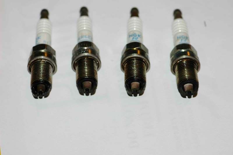 Two look dry, two look wet. The threads on three of them look wet. I know for certain, since I took them out, that all four came out of the engine dry and clean. There was a bit of oil in the spark plug holes (time for a new valve cover and spark plug gaskets, I guess) that coated the electrode betwen when I took them out and when I took pictures.