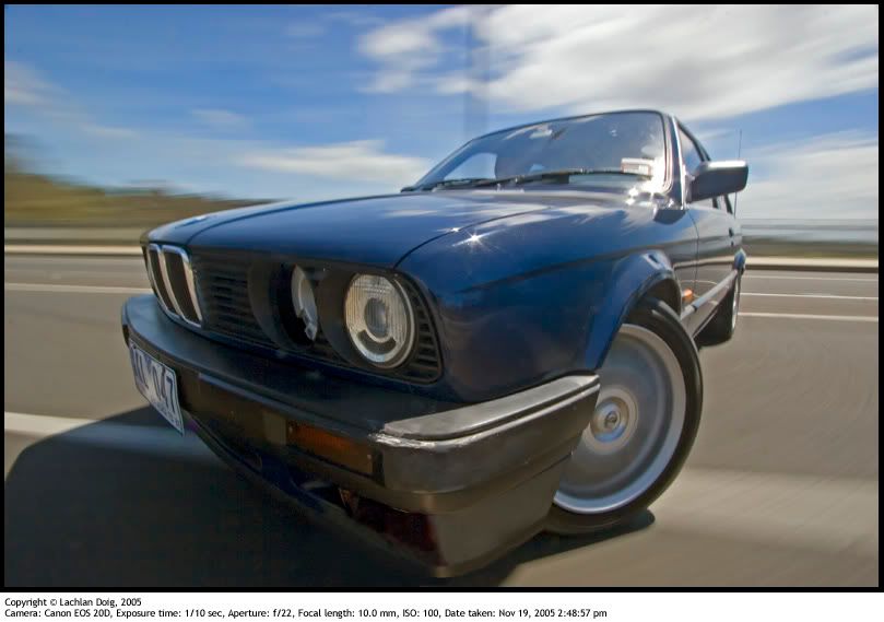 That's a really good action shot. Are those tire marks from previous attempts to get it just right or part of the distortion. How about that nick on the corner of the bumper - tell me it's from knocking the photographer down until he got it right!