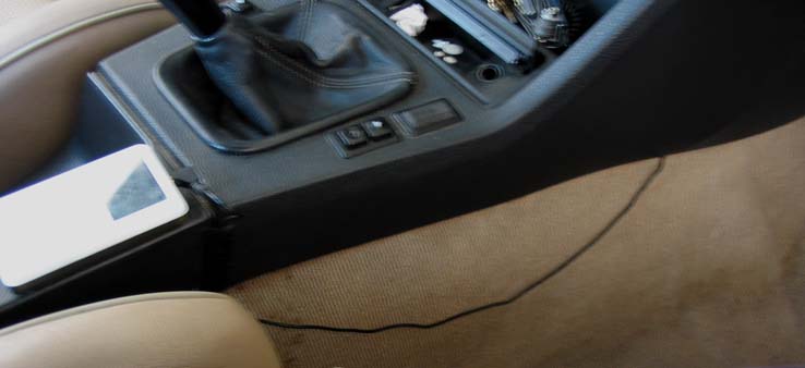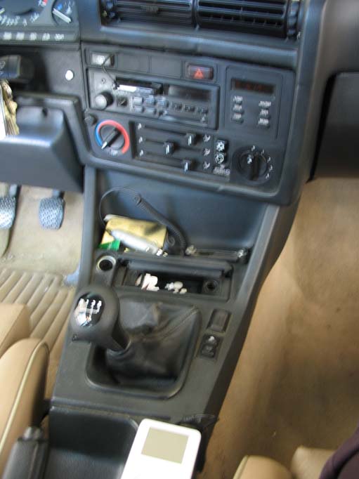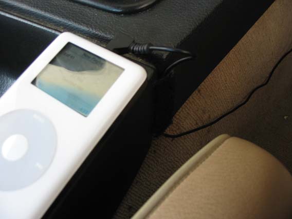 Run the cable along side the center console, and up through teh gap between the consoles (see pictures). I used a peice of velcro to hold the wire in the slot. You could also drill a hole behind the ipod. I chose the non-destructive route as I planned on upgrading to a Ipod ready head unit (which I did today, my Ipod is now mounted in my glove box with velcro).