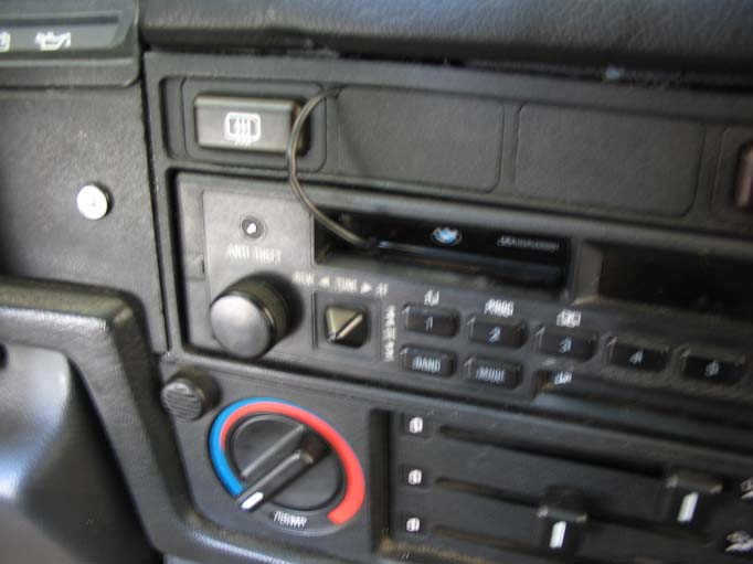 Tuck the cable up inder the console and push any extra wire up into the main console under the stereo. Put the block off plate back in place but leave one corner pulled so the wire can pass through. Put the cassette into the deck and make sure there is a little slack before you button it up fully. The idea is as little wire as possible showing. You could also drill or grind a small slot for it.