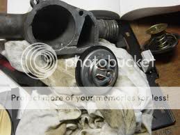 Remove the brackets and the wires that pass in front of   the thermostat housing. Use a 10mm socket. There are 4 bolts holding the   thermostat housing to the engine block. Pop the thermostat housing off the   engine block.