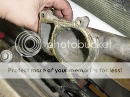I then applied a new seal and managed to carefully angle the thermostat   housing back into place while twisting it to avoid the fan blades that are   always in the way. The use of the Permitex helps because it keep the gasket   in place.