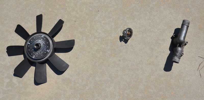 Fan blades with clutch. No guarantee on the clutch, as I have not seen  the engine run. $22 for the pair. 2,000  mile old thermostat. $8.  Thermostat housing. $8.