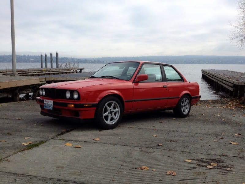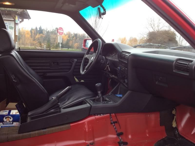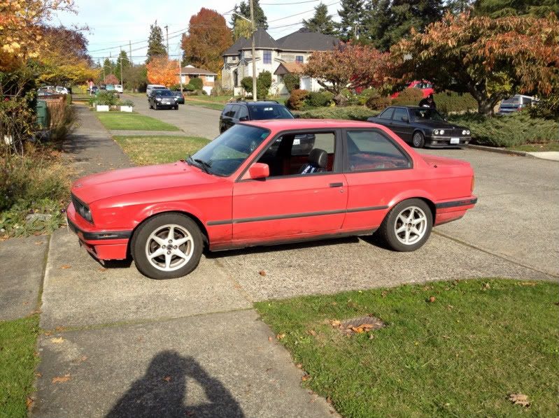 Enter me!  I see the car sitting at my friends house, and decide I have to have the car!  I have been daily driving a '98 Jeep grand cherokee 5.9l on 35's (10mpg on a downhill with a tailwind!) so the MPG of the e30 was my biggest turn on!  Work out a deal and the car is mine!  I start daily driving it immediately.  I got a key cut along the next day so I could lock it and had a new factory lighted master key ordered from Germany (LOL!) along with replacing the ignition housing.  I ordered and installed an IS front lip last week, and got super lucky and found a rear parcel shelf minus premium speaker setup and a black leather rear seat and door cards and all seatbelts and things I was missing.  now all I need are some front seats and a carpet kit for the interior!  Ill get some more pics up of it later today showing the interior and IS lip :)