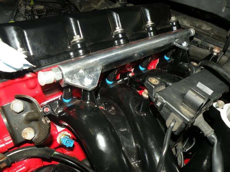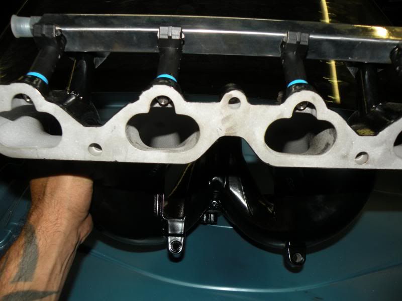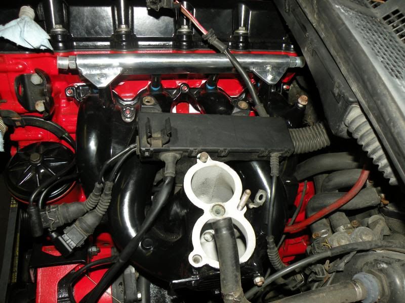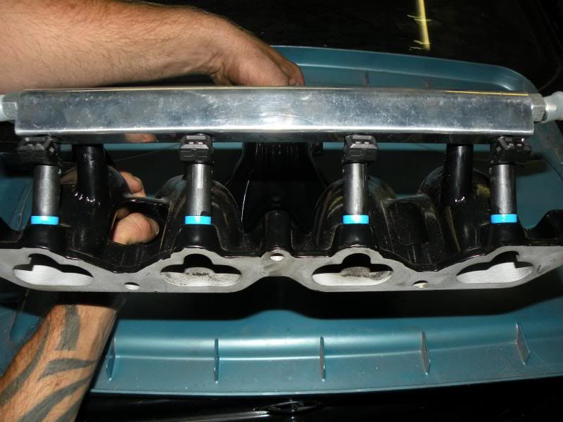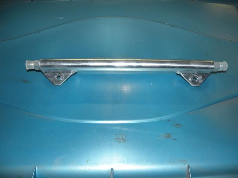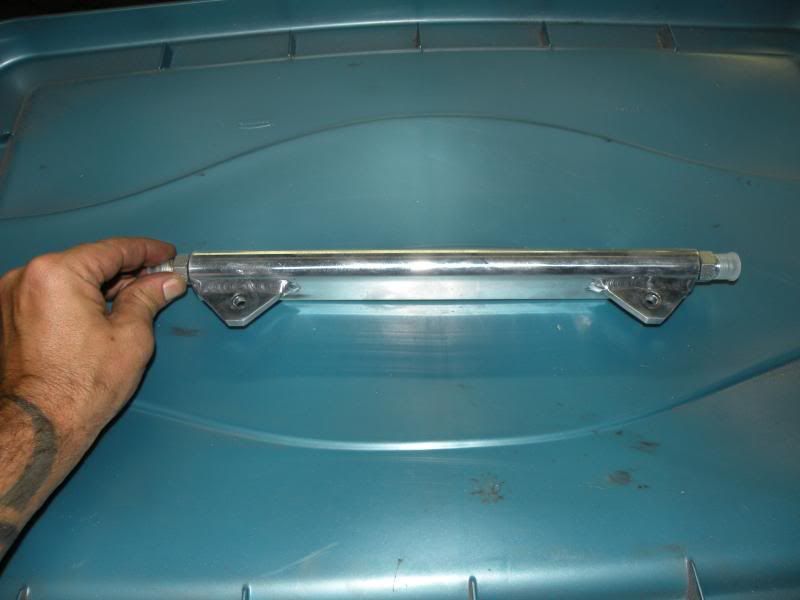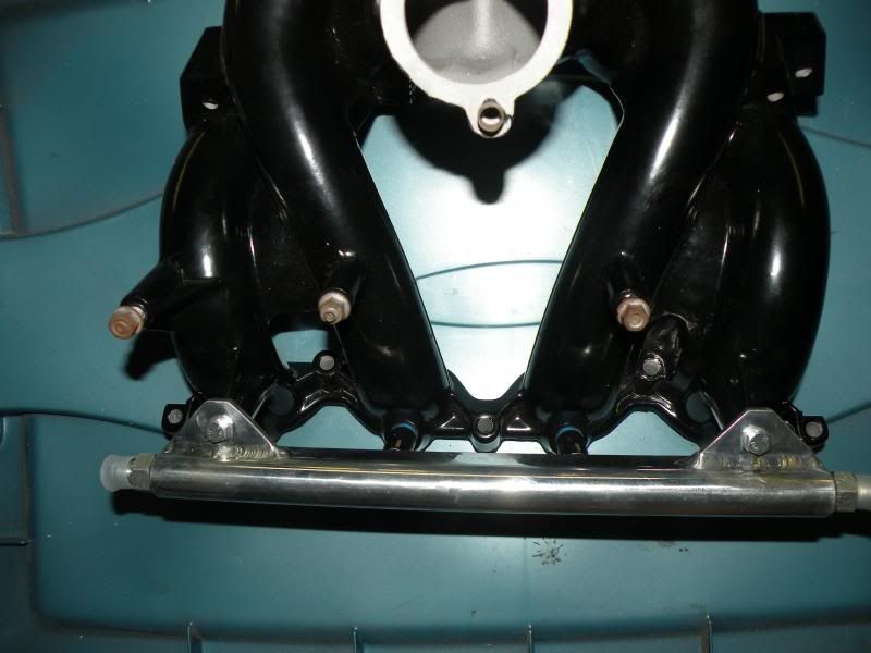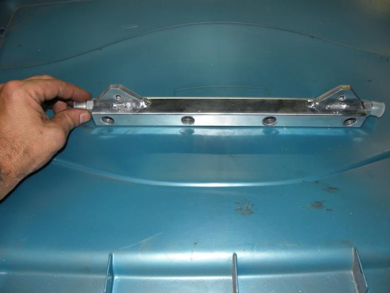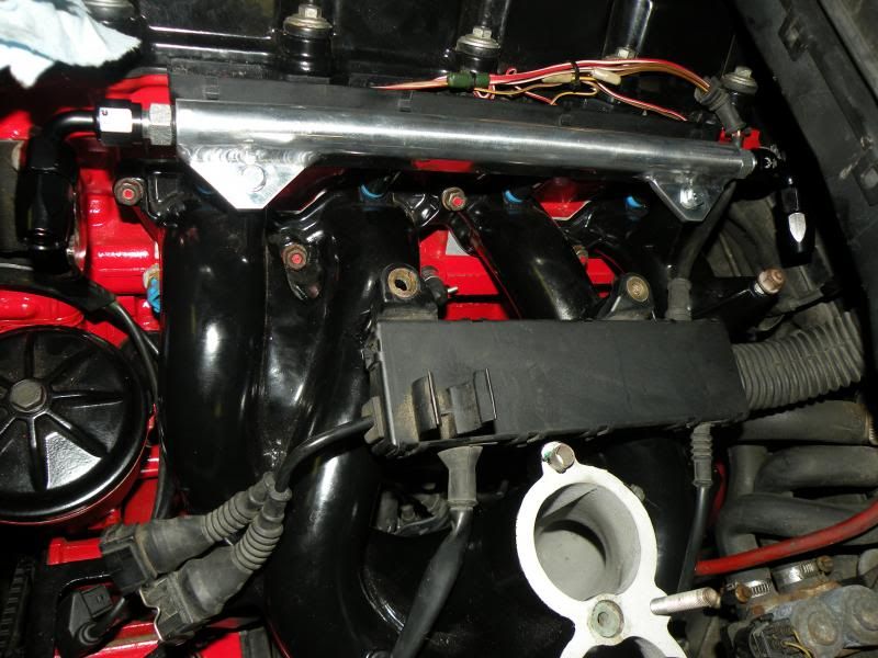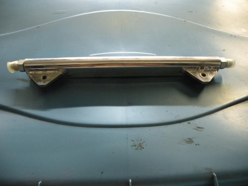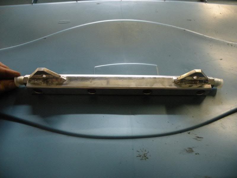 I choose to retain the stock intake, as it will flow easily in excess of 500HP, but the longer runner design will kepp the torque numbers nice for city driving. But I came to a problem, as no one makes a billet fuel rail for the stock M42 intake manifold. So we had to build a gig and make a fuel rail ourselves. We actually made 5 just in case other people needed them. The Billet Fuel Rail looks and works great, nice fit. Not sure, but we are considering powder coating it black, not sure, but I think it should be black, made even anodized?  Well here it is: