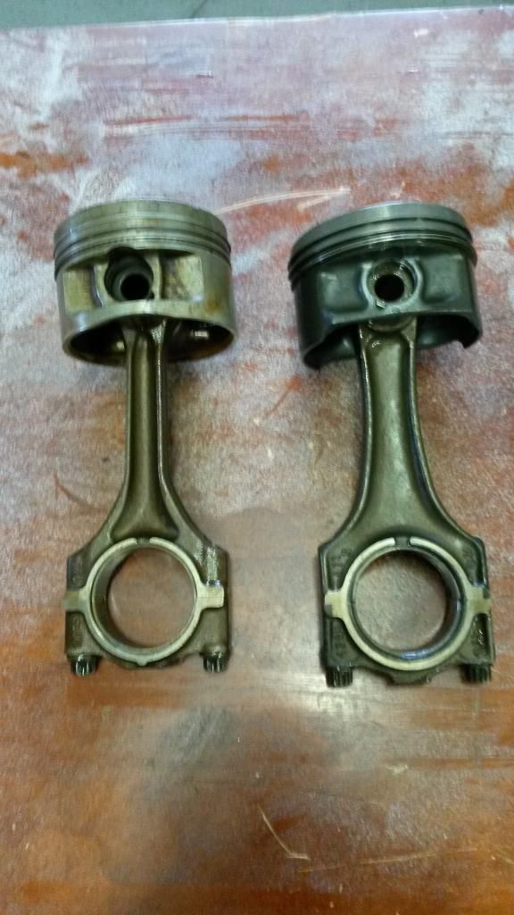 And this is a comparison of a late m42 rod (140mm) and piston on left to a stock m50TUb25 rod 11241721471(140mm) fitted with s52 piston on right.