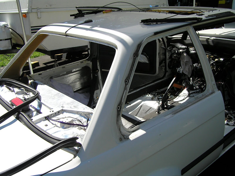 Windows are out, carpet is out, headliner is out, test fit of the new headliner revealed that it really isn't as plug 'n play as we would like...  the loops holding the bows in are sewn all the way to the edge, but the headliner needs to extend past them to the edge of the rear side windows.