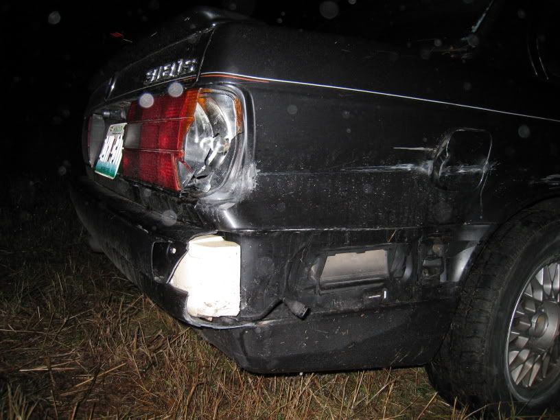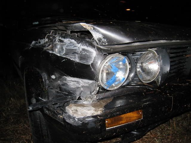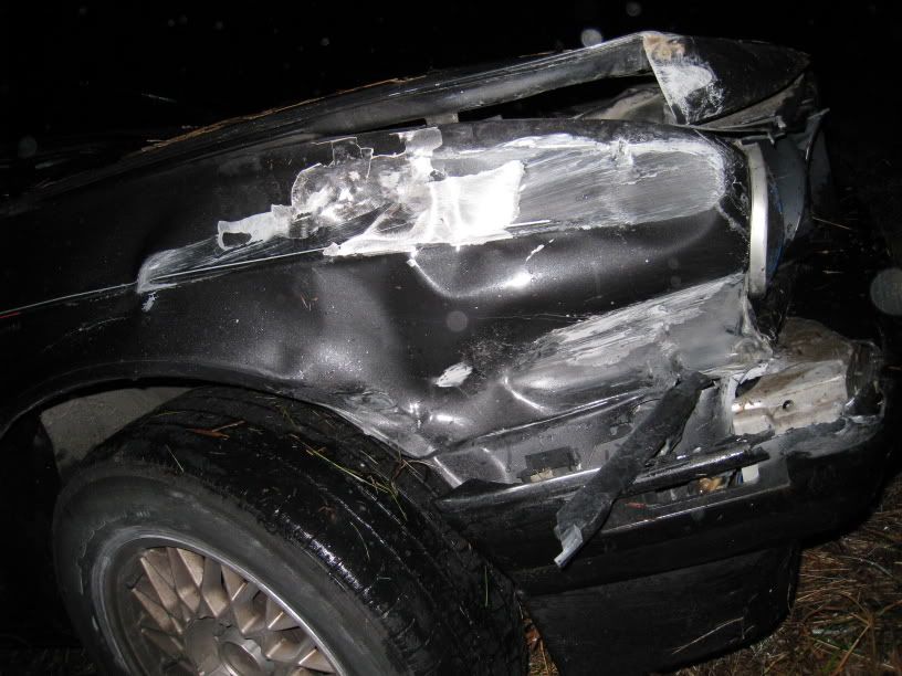 take the on ramp for another highway. Well I was going around 60-70 mph and hit a slippery spot. The back end came out and I tried to counter steer like I'm used to. It gripped and threw me into the guard rail on the right side of the road front end first, then the back end came around and hit the guard rail and then sent me off a huge hill at about 50ish mph. I took down a street sign poll before going down to the bottom of a huge ditch. I sat in my car for about 30 minutes before getting out, just screaming at the top of my lungs. I finally got out and looked around. Its not as bad as you would think but I havent seen the under body. The hill I went down had a bunch of HUGE logs that I tumbled down. I'm surprised the car didnt roll. I'll try to take some pics soon.