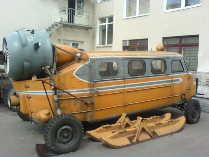 Thats a russian-jet-powered-very-old-school-expedition-vehicle-with-skis found with google.. Must be a lot of fun driving around with that!