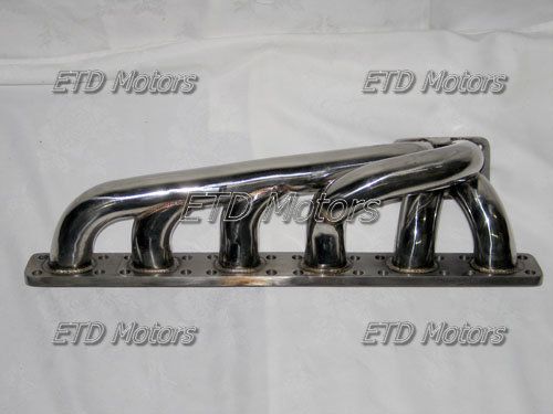 If your dad works at a custom shop then why doesn't he just make a manifold for you? He should have nice SS bends around and a few plates later you're all done. Heck, go grab a OEM header and see what he can build off of it.