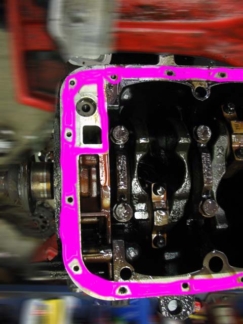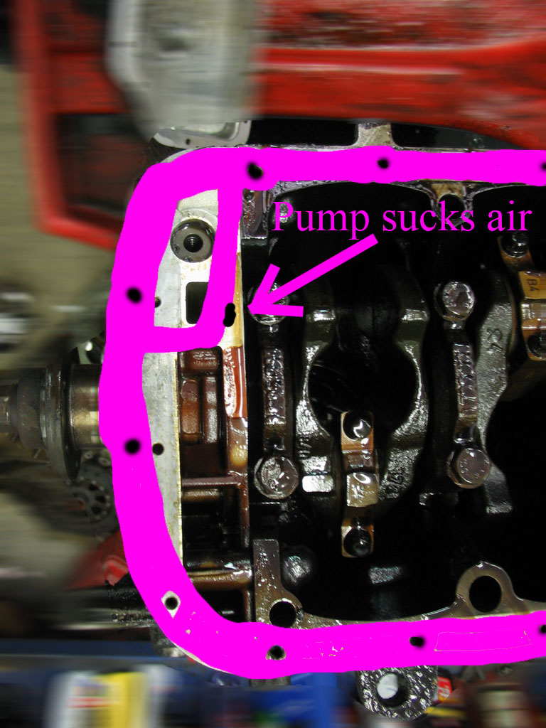 which bolts to the block. This is sealed by an ear of the pan gasket. When the bolts come loose and fall out, the front edge of the pan, can slide forward, allowing the pump to suck air from the oil pan. When this happens there is no way to prime the pump, or get any oil to flow. Run too long like this and the engine will grind to a halt. Also, there was no oil leaking from this engine, so do not use this as a gauge to see if yours has the problem.