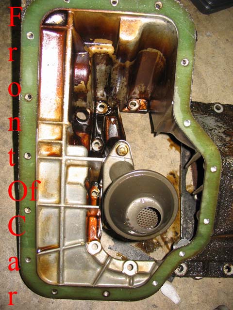 The upper pan however, was extremely loose. Some bolts came out with our fingers! When we got inside, 4 bolts were missing, one was finger tight. If you look real close in the pictures with the pump pickup, you can actually see threads pounded into the pickup. The pan would drop down, a bolt would get just underneath, and then the pan would get hit, imprinting the pickup with its threads.