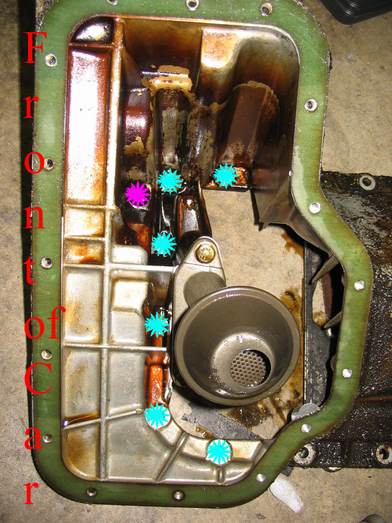 The thee bolts closest to the dipstick along the front are the 3 most important ones we are looking for, however you obviously want all of them. Blue designates a pan bolt.