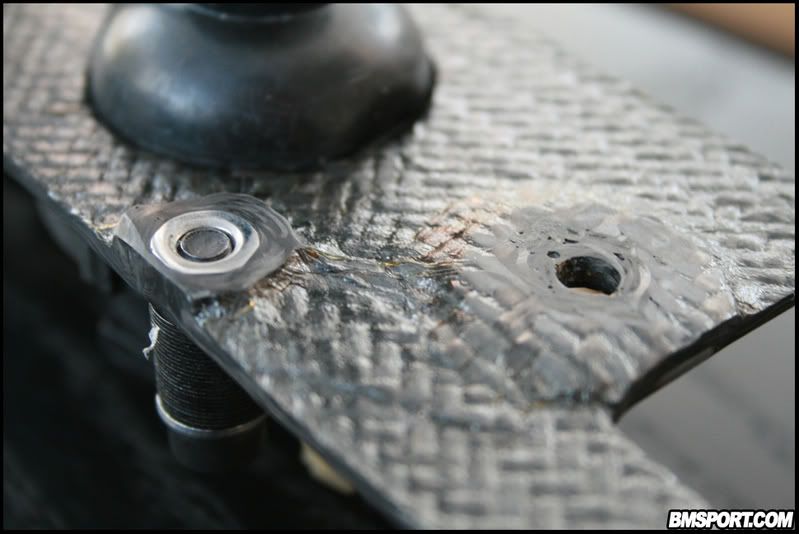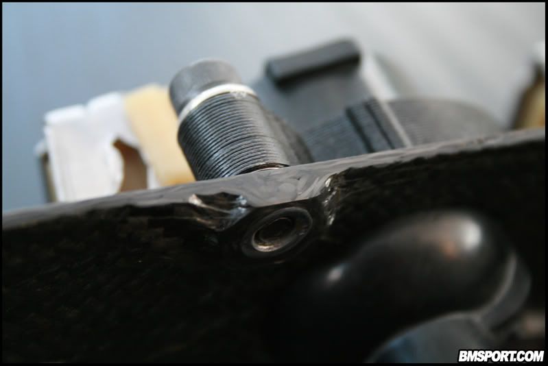 The same was done for the cam-cover mounting points (x2) on the rail. I used large M6 washers to add some reinforcement to the ends which get bolted down. If you look closely at the 1st picture you can make out the outline of a washer inside the carbon layers.