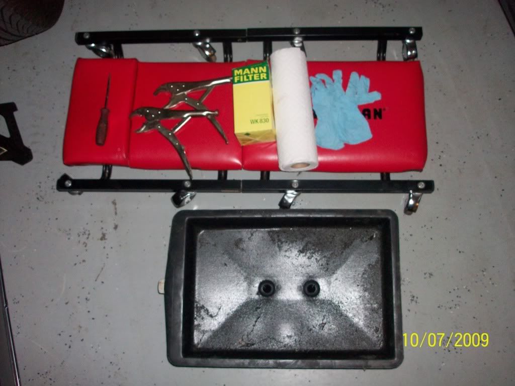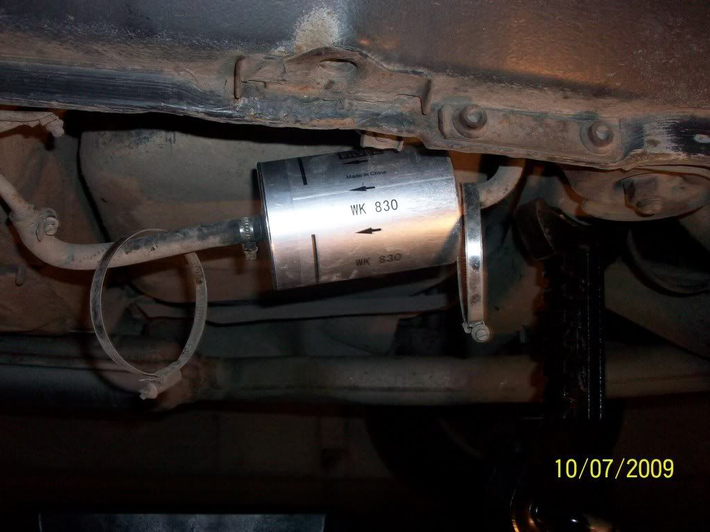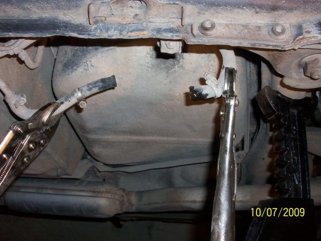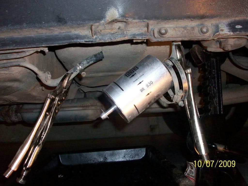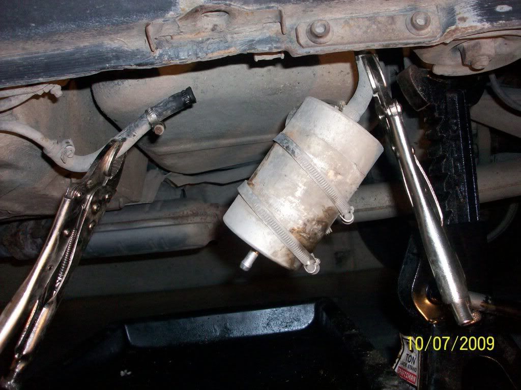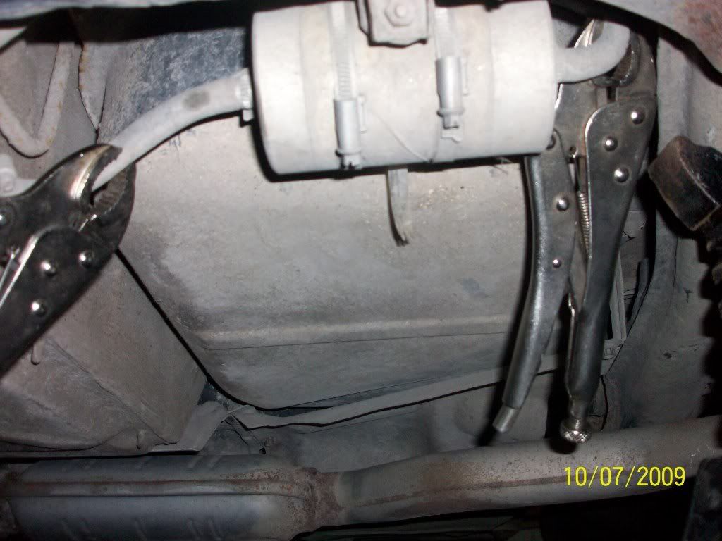 Locate your filter, drivers side in front of the rear wheel well. Use your 2 vice grips and lightly clamp the hoses that go into the filter and exit the filter. Be careful not to tear the hoses, it doesn't take much pressure to block the lines.